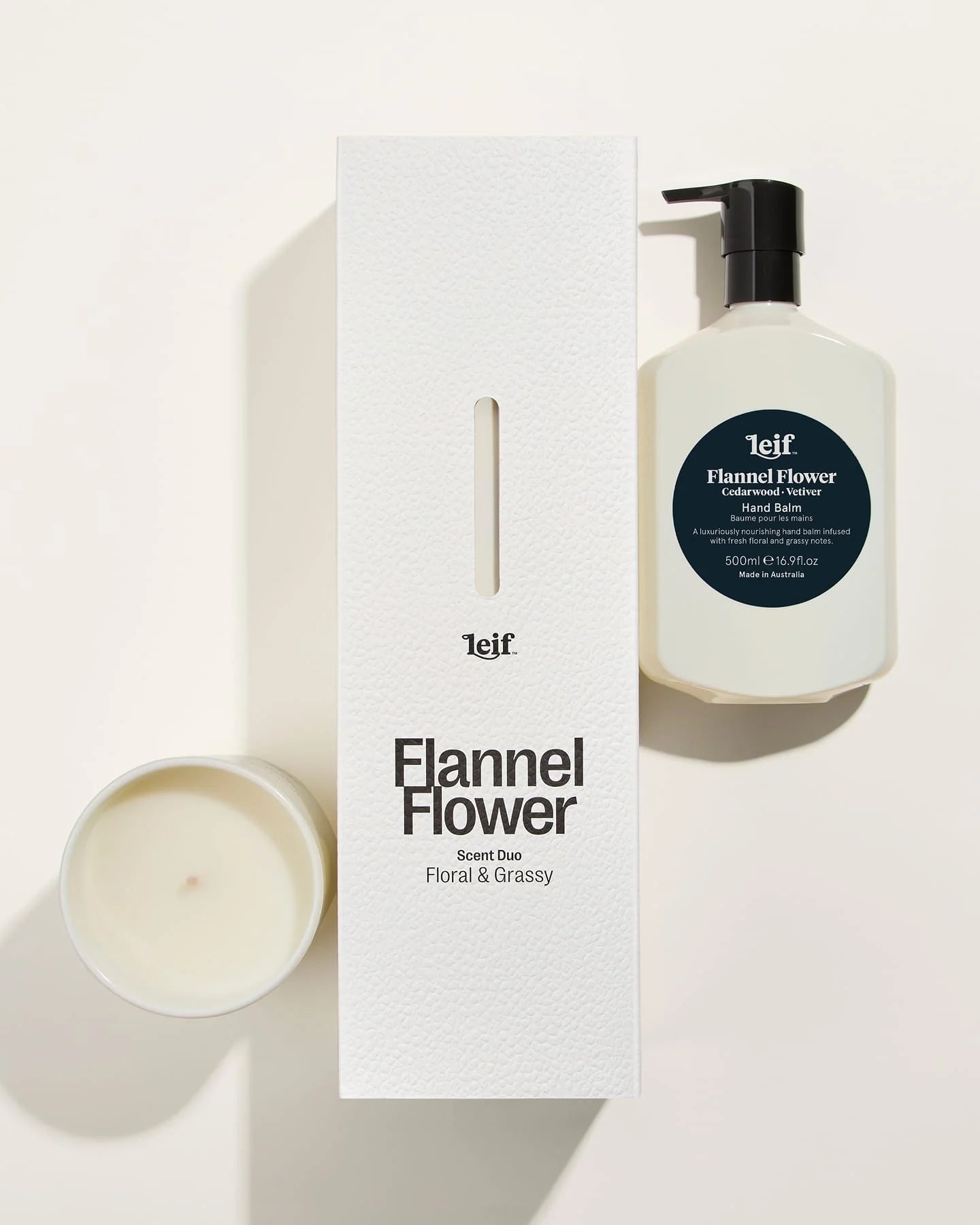This gift set ties together Flannel Flower Hand Balm 500mL and Candle 280g, presented in a beautifully minimalist, recyclable box featuring FSC-certified materials.