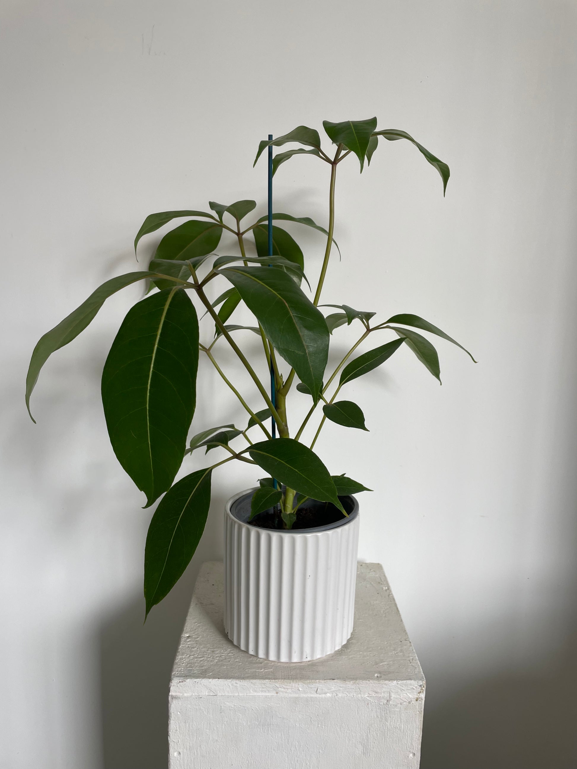 The Umbrella Tree is a fast-growing, tropical tree prized for its lush, glossy, bright-green leaves that droop downwards, creating a weeping effect