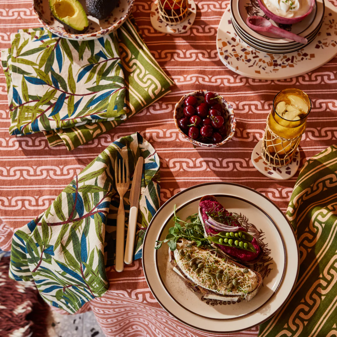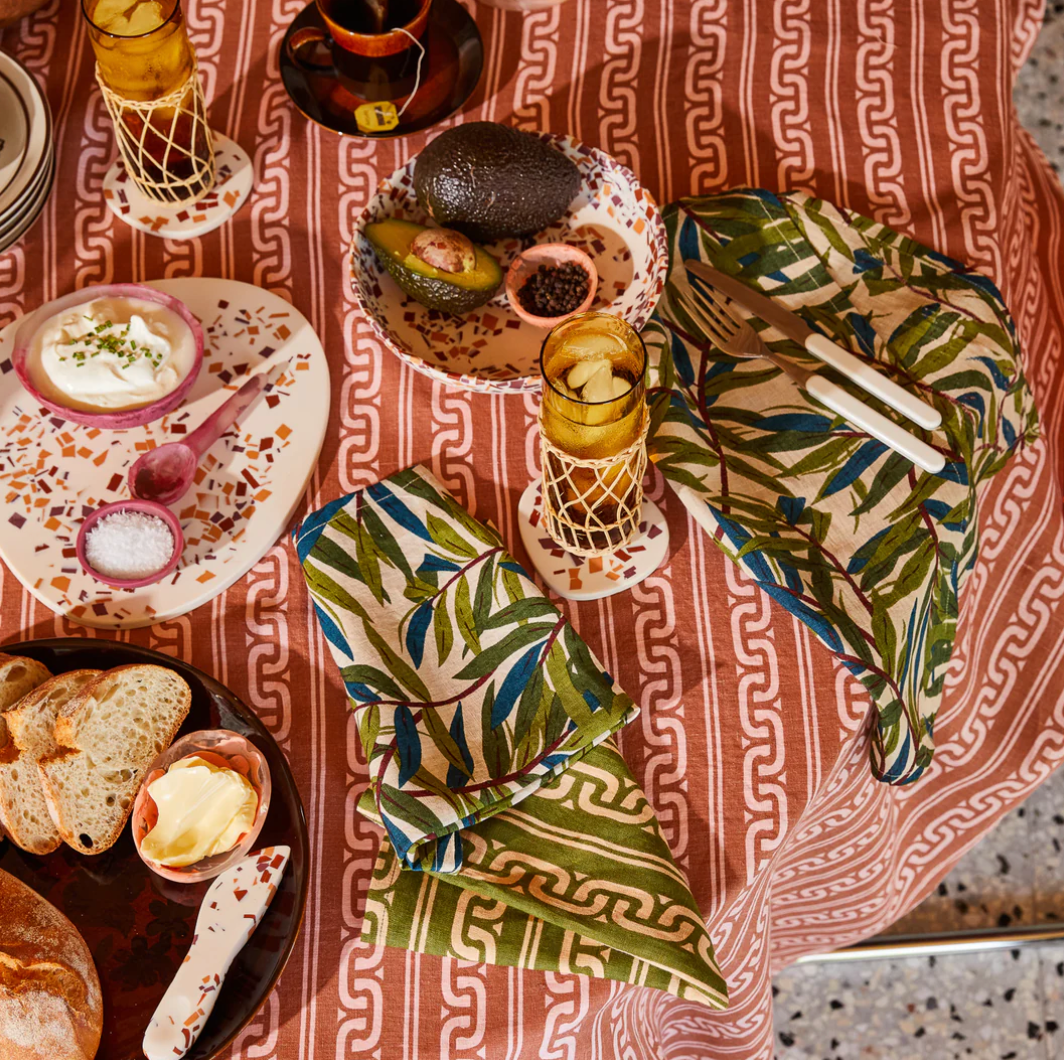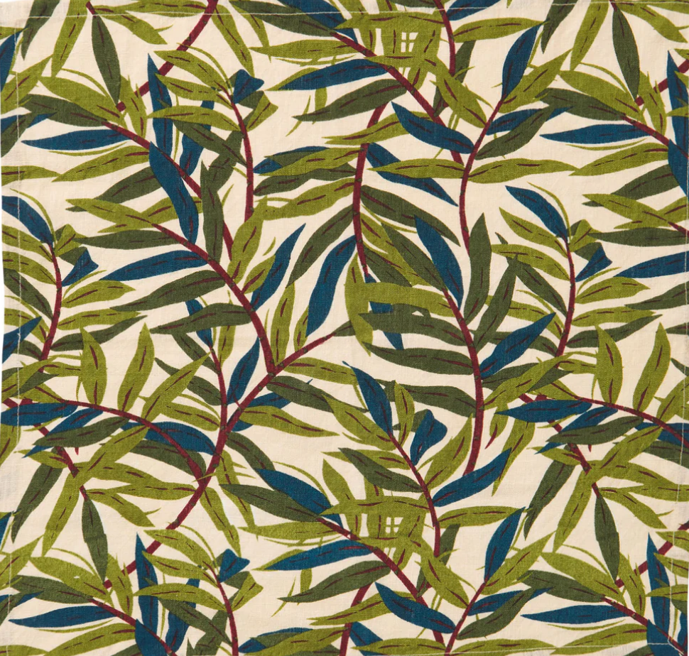 “Enjoy the eclectic and inviting feel of contrasting patterns with this set of four linen napkins. A leafy bamboo motif pairs with an Italianate inspired print, creating an unexpected medley of colours and designs.” – Phoebe’s Style Notes
